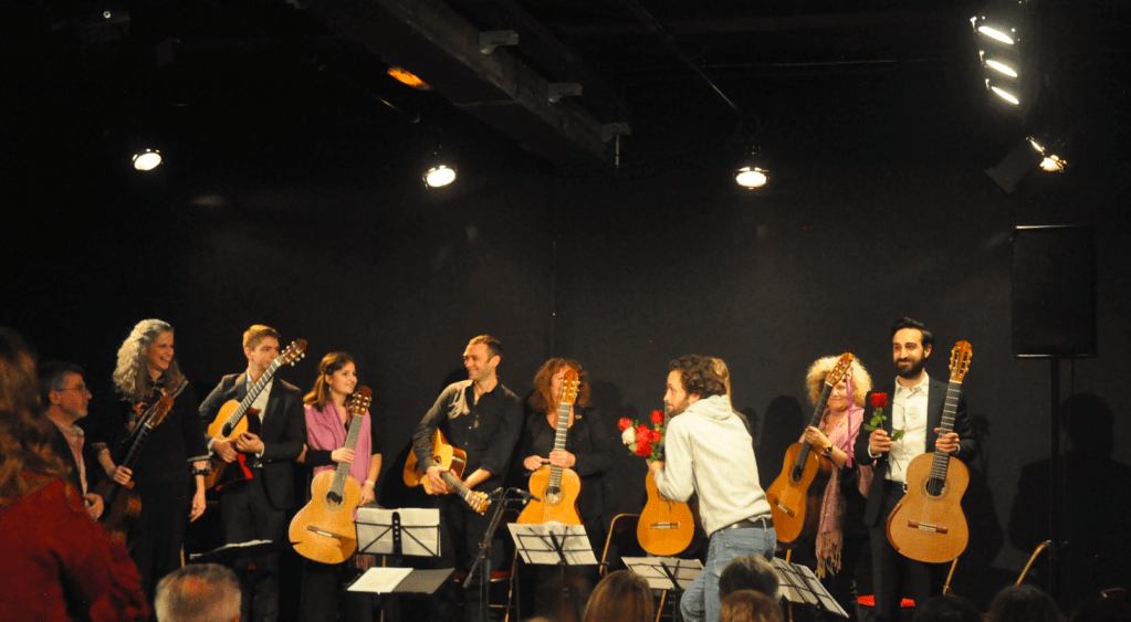 » Don’t Ask the … skaï » et » La rose » de Manos Hadjidakis. Arrangement pour ensemble de guitares de Roland Dyens – Avec Elena Papandreou, Dmytro Holovenko, Orestis Kalampalikis, Cassie Martin, Martyna Ciesielska, Valérie Folco, Valérie Duchateau, Armen Doneyan. Direction : Jean-Marc Zvellenreuther. Concert de lancement de l’Association » Roland Dyens in the skaï » le 19 octobre 2018 à Montreuil (France 93).