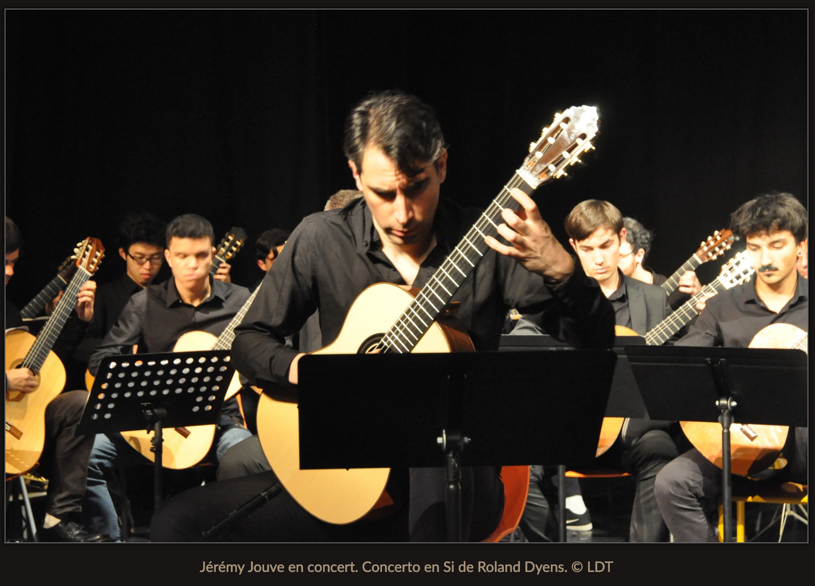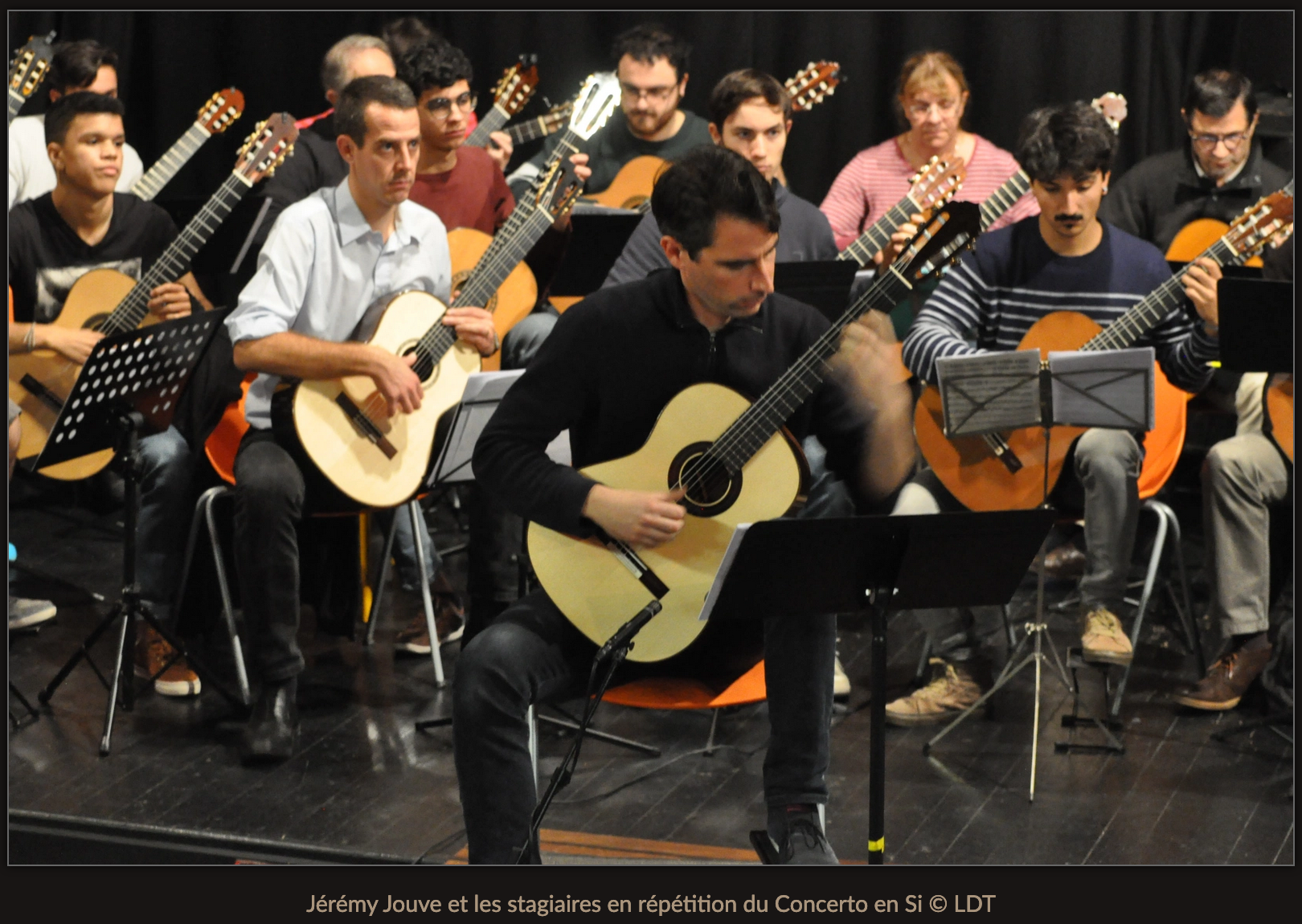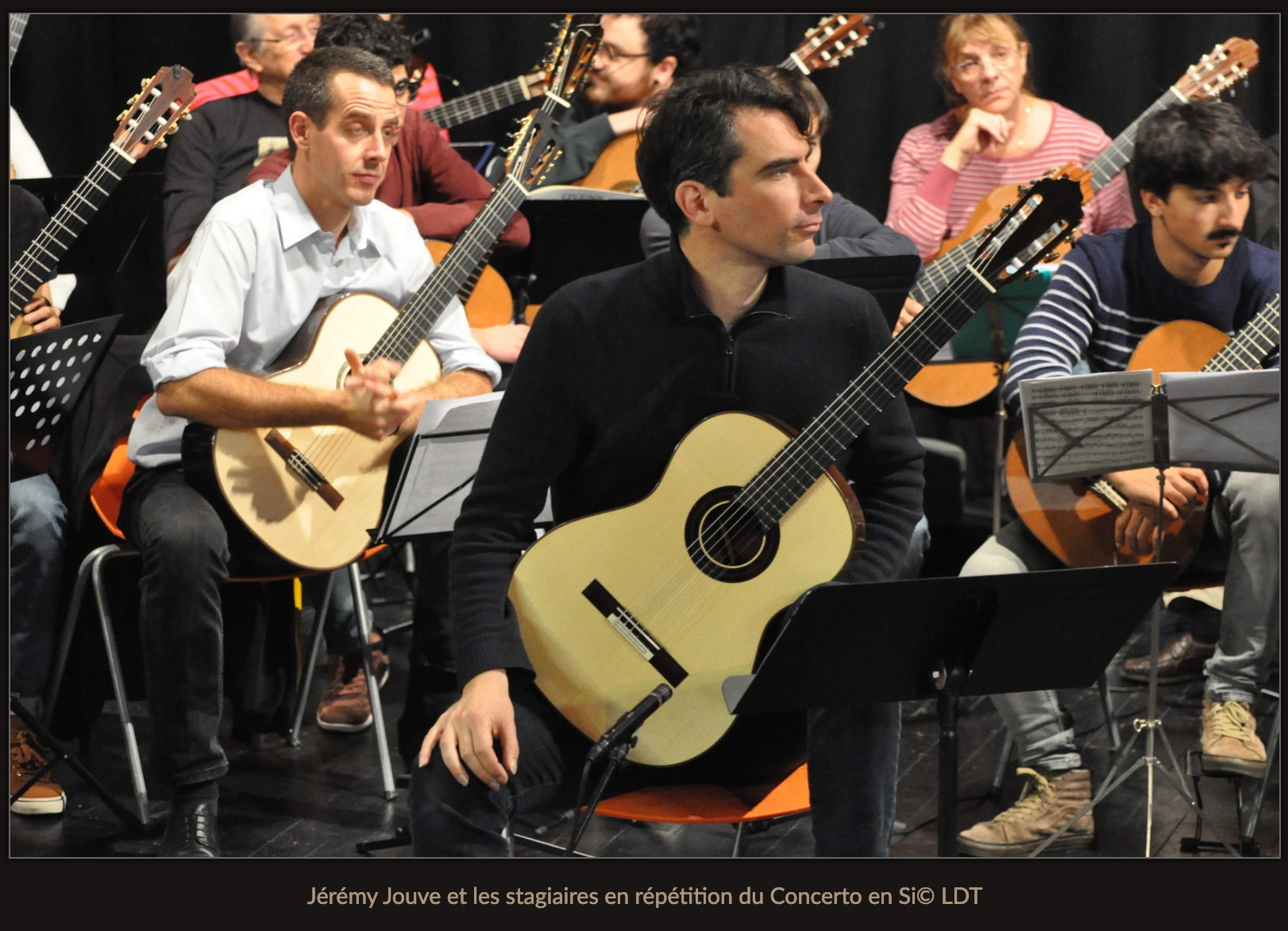 Cette année, Olivier Saltiel a choisi de monter avec les nombreux stagiaires, le Concerto en Si pour guitare solo et ensemble de guitares de Roland Dyens, et a invité Jérémy Jouve, ancien élève de Roland au CNSMDP pour la partie soliste et Laurent Blanquart pour la direction d’orchestre.