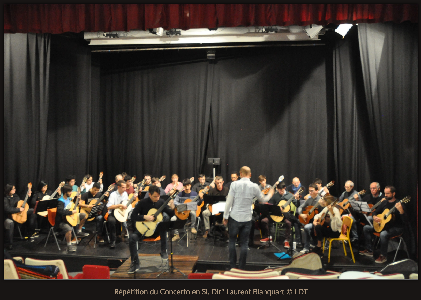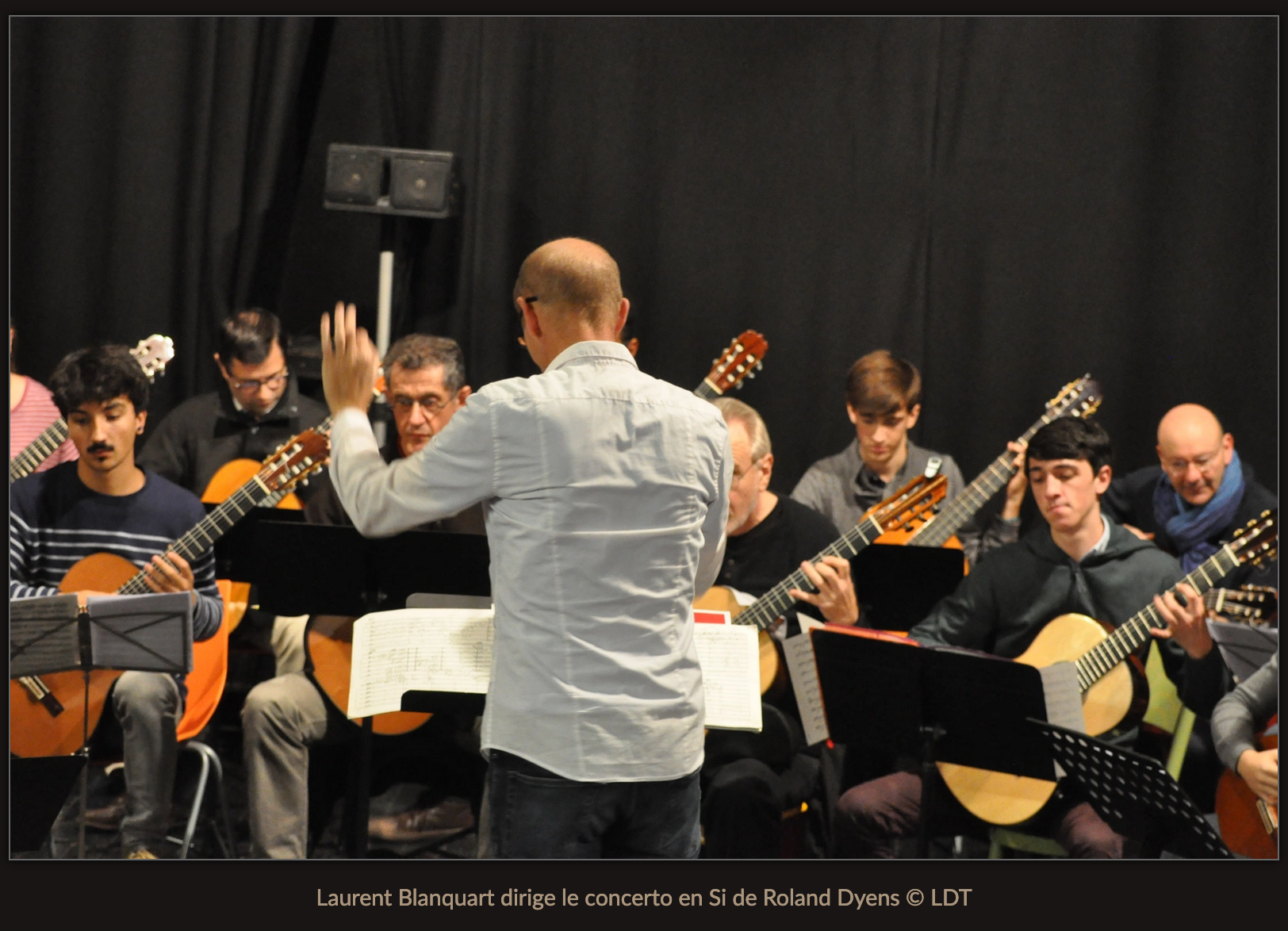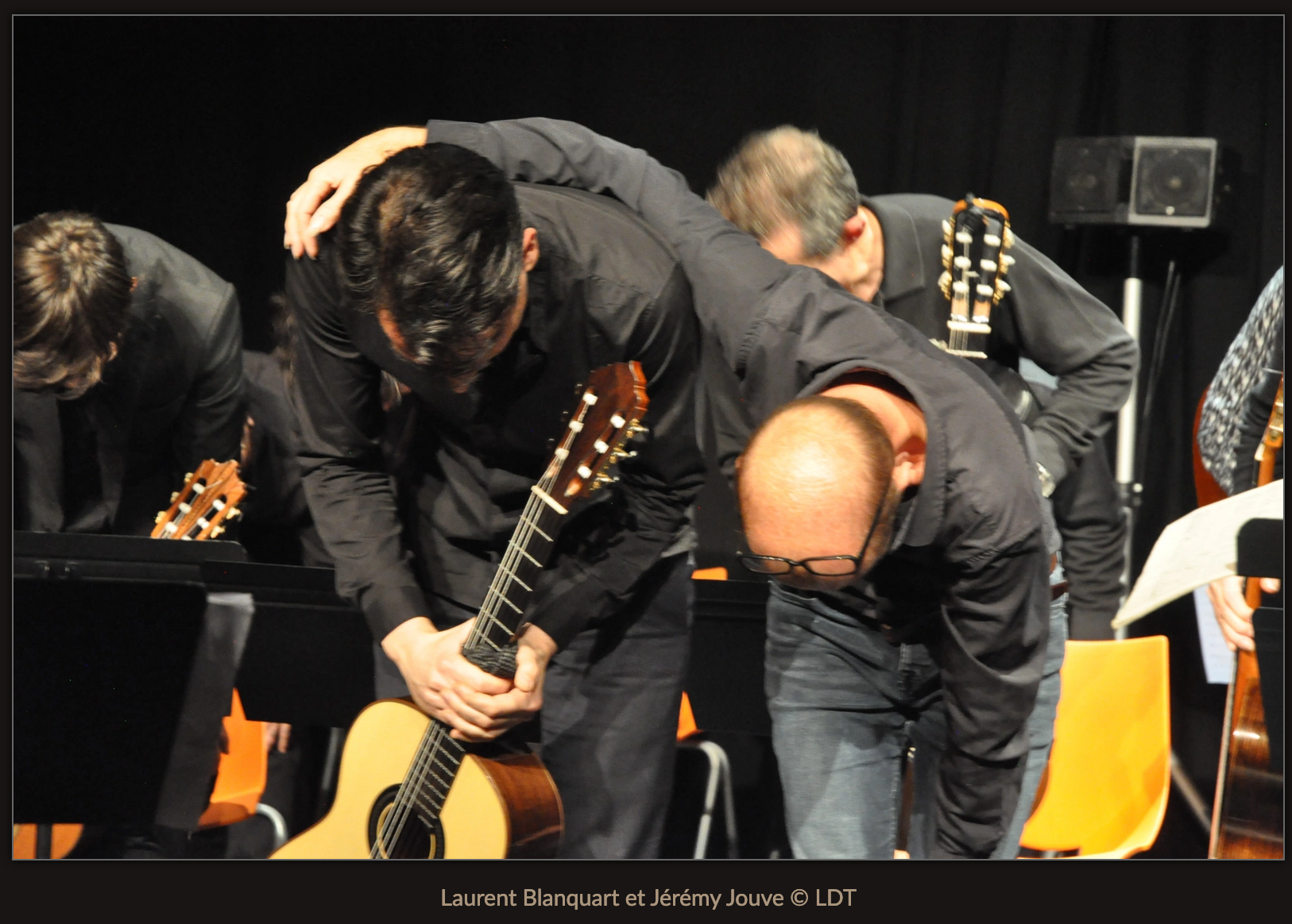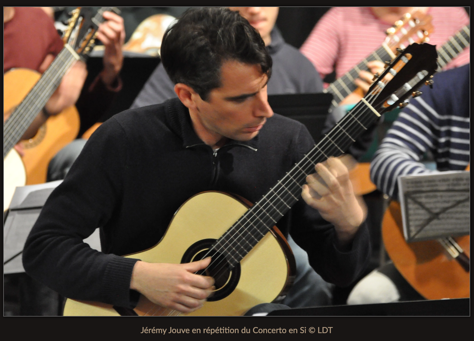 Cette année, Olivier Saltiel a choisi de monter avec les nombreux stagiaires, le Concerto en Si pour guitare solo et ensemble de guitares de Roland Dyens, et a invité Jérémy Jouve, ancien élève de Roland au CNSMDP pour la partie soliste et Laurent Blanquart pour la direction d’orchestre.