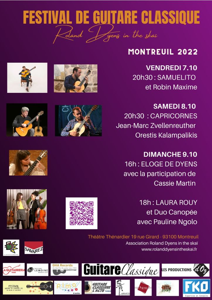 Le 1er Festival de guitare classique Roland Dyens in the skaï placé sous le signe de la musique du guitariste et compositeur Roland Dyens, aura lieu du vendredi 7 au dimanche 9 octobre 2022 au théâtre Thénardier (93100 – Montreuil, FRANCE). Il remplace la Journée Dyens’Memory qui avait lieu chaque année au mois d’octobre depuis 2018.