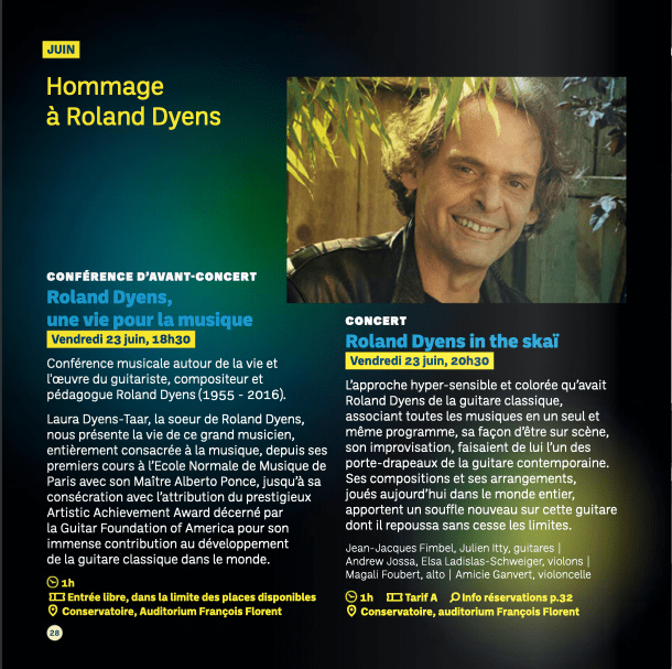 Le vendredi 23 juin 2023 à 18h30, le conservatoire de Mulhouse vous invite à assister à une conférence à 18h30 autour de la vie et l’oeuvre du guitariste, compositeur et pédagogue Roland Dyens (1955 – 2016) suivie d’un concert 20h30.
