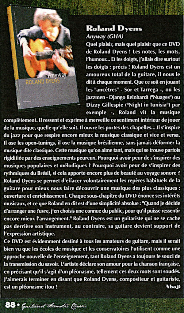 Ce guitariste de formation classique est aujourd’hui professeur au Conservatoire de Paris. Sa guitare et son talent ont franchi les frontières d’innombrables pays sans compter celles du jazz, de la musique populaire, de la musique brésilienne et de la chanson française, autant d’approches musicales présentées et même racontées par Roland Dyens dans Anyway, son premier DVD.